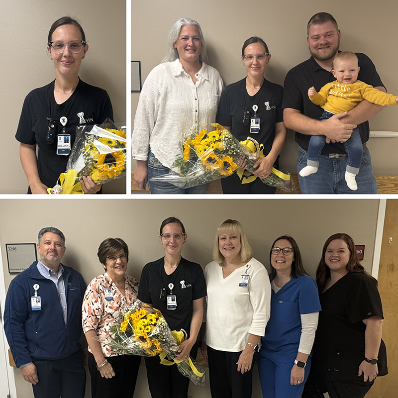 Pictured L-R: Ambulatory Care Team Leader Brandy Quinn; COO/CNO Kathy Martinez; Kaydra Heller, RN; Nursing Operations Leader Stacey Winter; Inpatient Nursing Director Heather Just; and the nominator's husband, Brandon.